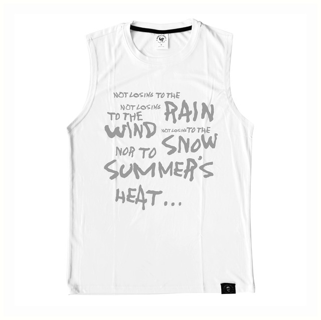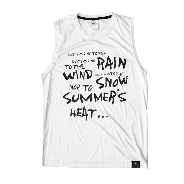 雨にも負けず(United Athle 4.4オンス ドライスムース リサイクルポリエステル スリーブレスシャツ)ホワイト